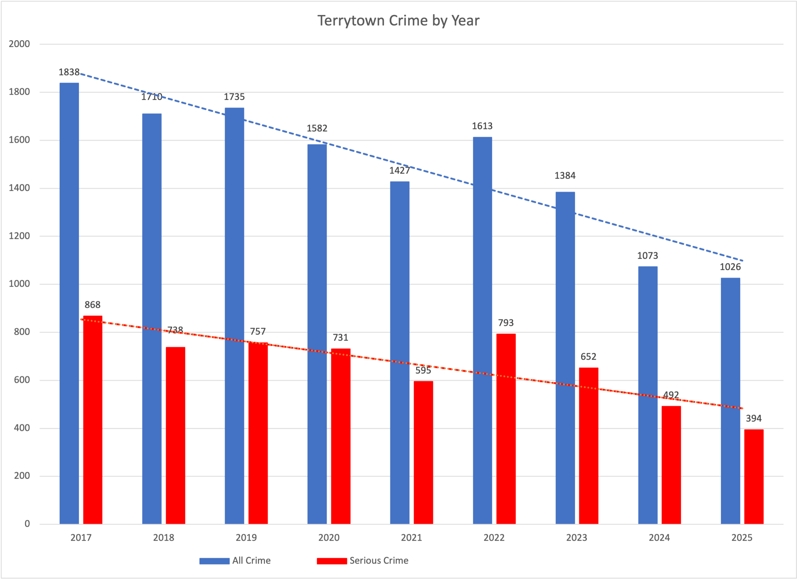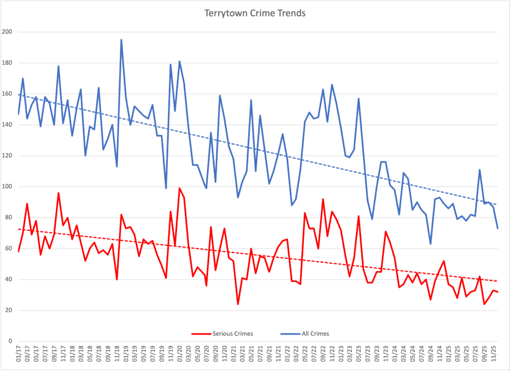 As can be seen in the first chart below, the monthly crime statics are highly variable. As a result, at times residents are correct in concluding that crime has increased in Terrytown, at least in the short term. And when that happens, the concern is fully justified. At the same time, it is important to look at the trend over a longer period before making personal decisions for the long term.